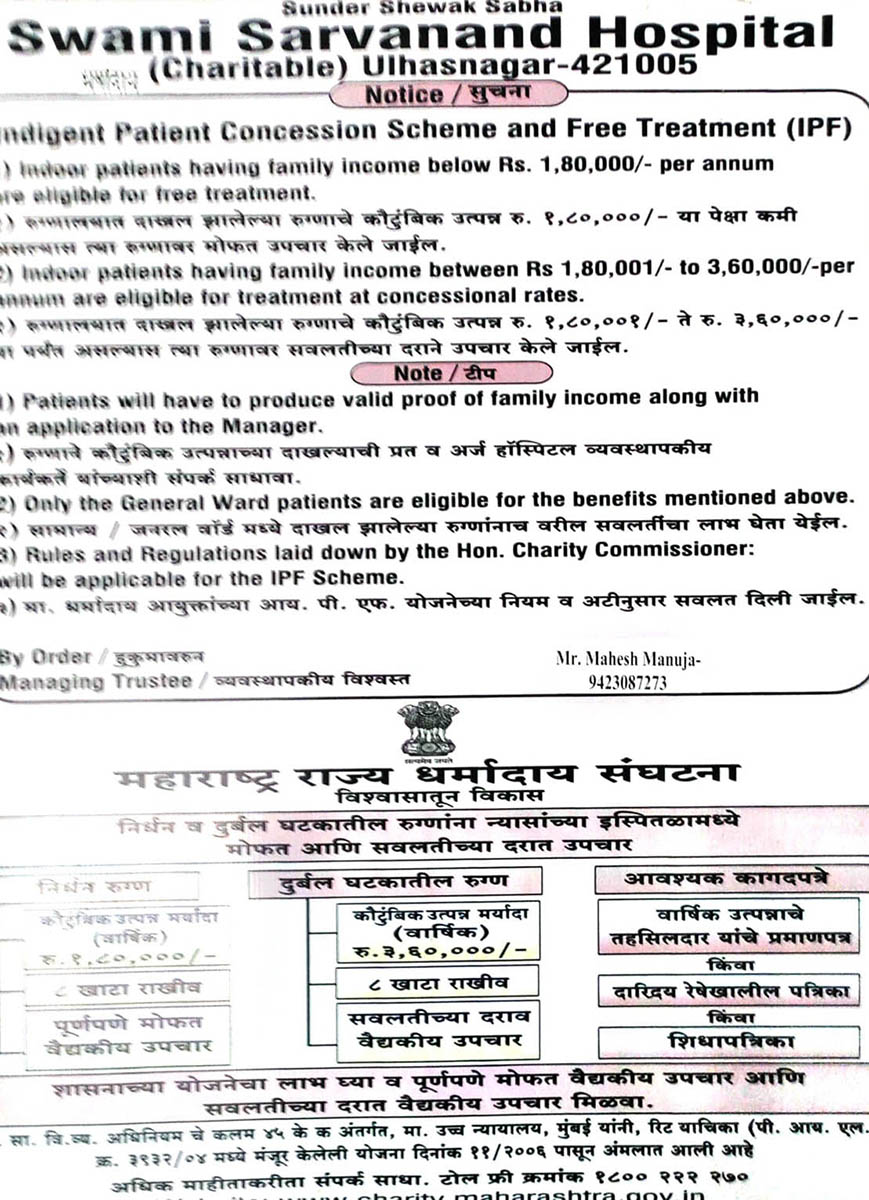 M/S Sunder Shewak Sabha a Public Trust was established by Philanthropists in the year 1916 at Sukkur, Sind, now in Pakistan. Trust restarted its activities in the year 1950 in Ulhasnagar – 421 005. Since then we are serving the residents of Ulhasnagar & its surroundings in MEDICAL & EDUCATION fields.